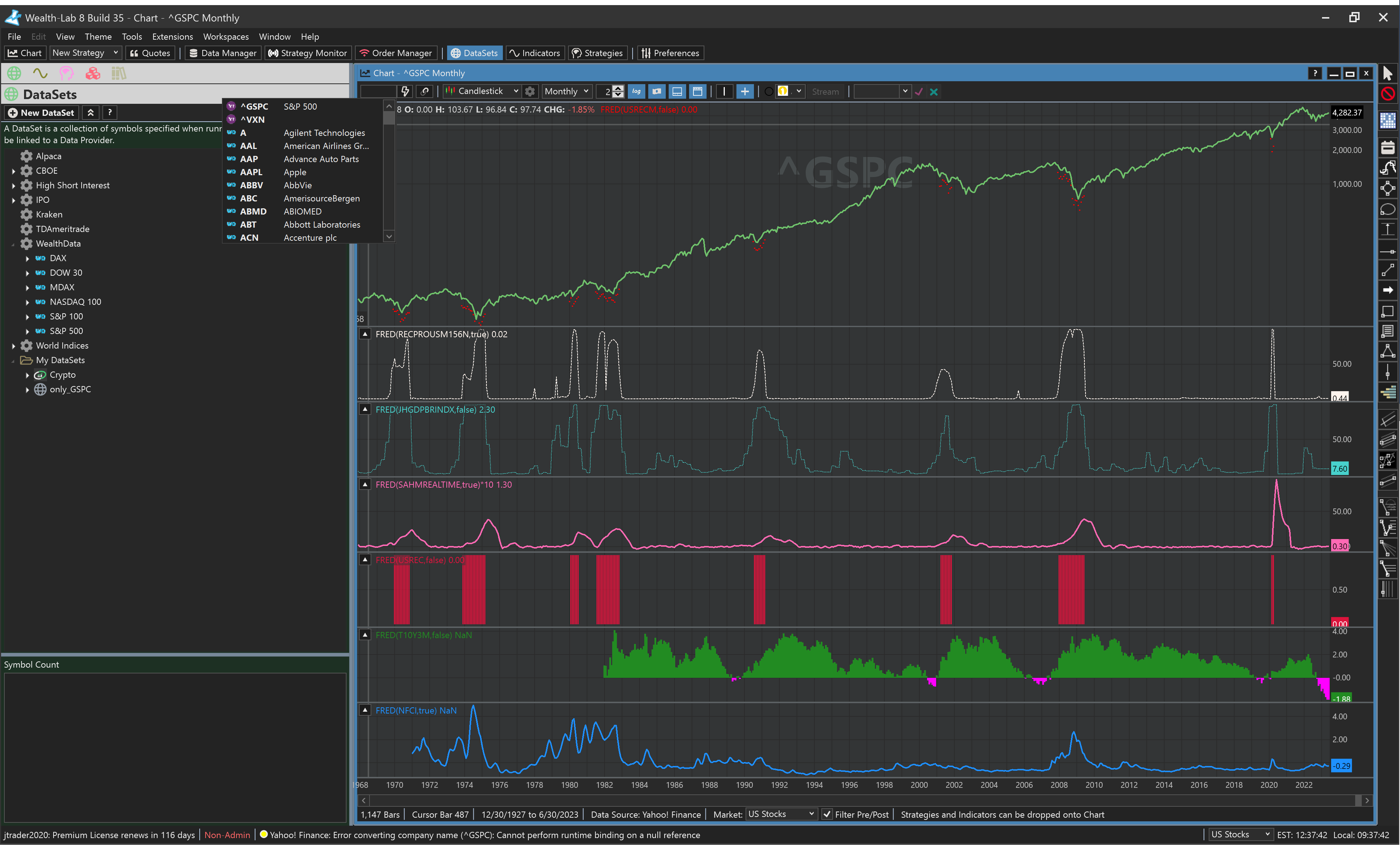 There are only about 5 or 6 of them that I mostly care about. Since there is no way to easily just save a Chart with some subplots, I use Workspaces for this. So the Workspace really is just a chart of ^GSPC or SPY with some subplots (FRED data and some "rolling" calculations on the FRED data) and a couple indicators on the chart of the ticker. If you'd like a screenshot, let me log into this thread from that computer and I'll try to post a pic.