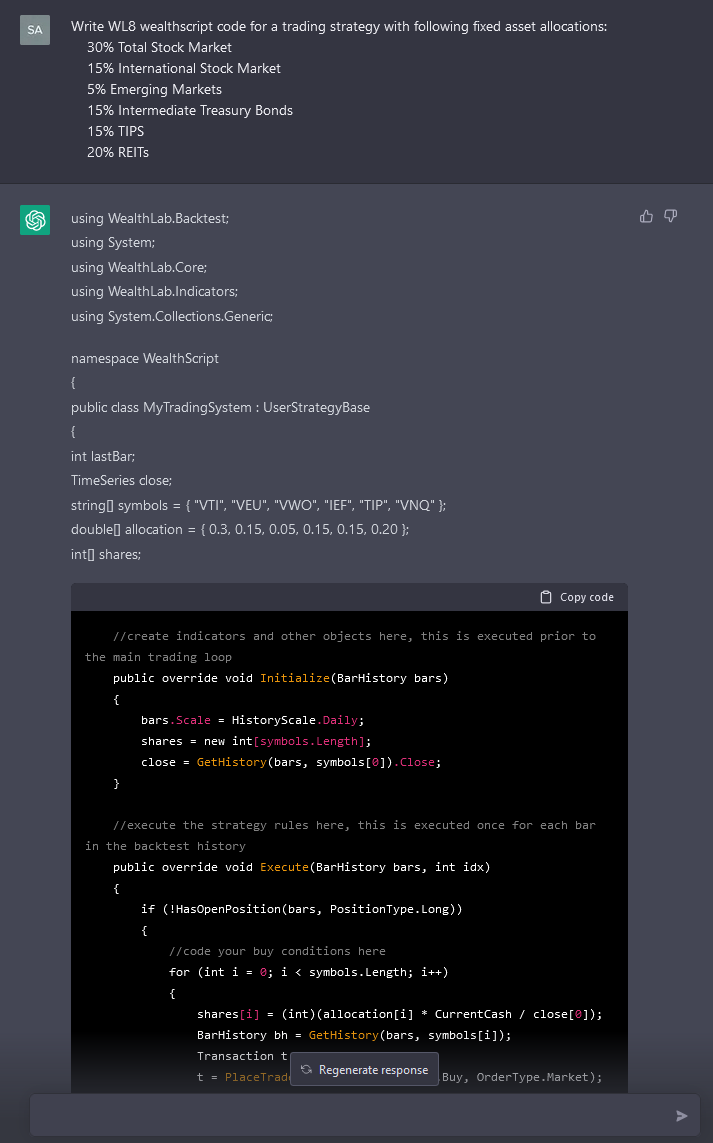 1. Coding (I only tested simple to moderately complex systems): It can code from scratch if you give it specific rules; however, it often uses a mix of WL6 and WL8 (and even plain English) - not a big deal as its fairly easy to convert WL6 to WL8 language. The code may be incomplete - it can't be expected to know all of Wealthscript as its a custom language + the website froze a few times while I was testing. However, there may still be enough material to build upon; sometimes that's all one needs when stuck. You can always regenerate a response (though you'll lose the previous one).