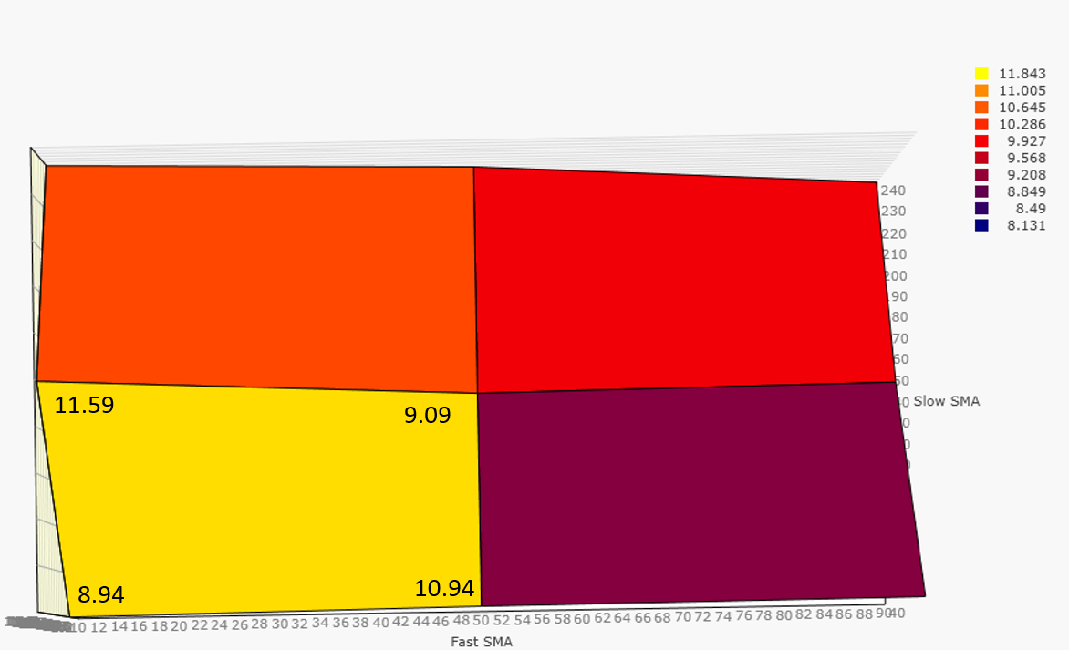 For example, the APR (the 3rd axis) of the 4 corners of the yellow section are shown in the plot, ie 11.59/9.09/8.94/10.94. Averaging these 4 values does not product 11.843 which is shown in the legend.
