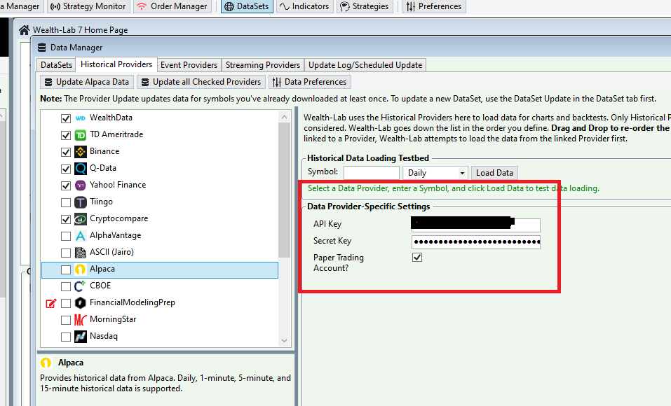 Unable to use Alpaca, I get the message "The Provider needs to be configured in the Data Manager before use", but the option to configure is grayed out etc..