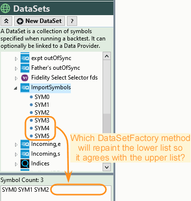 CODE:In addition, is there a DataSetFactory.Instance method that will repaint/update the lower list in the screenshot below so it agrees with the upper list? Shouldn't the WPF control of the top list, whenever it changes, automatically trigger an update of the bottom list so both lists always stay in sync?