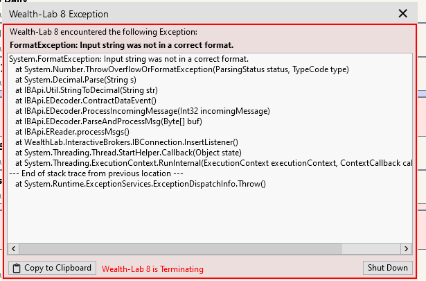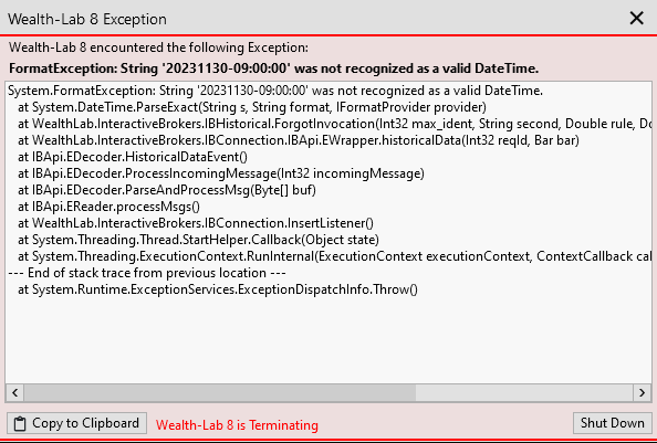 I am running a simple intraday backtest on dow 30 stocks, using among other things time indikators for entry and exit. This error message pops up and wl crashes. This machine is a virtual server.