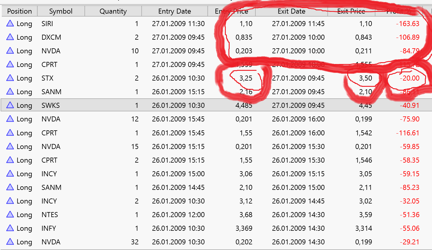 Strongly negative profits are displayed and calculated even though the exit price is greater than the entry price (as you can see in pictures beow). That should be all profits and no losses. Can you help please?