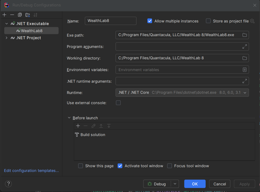 I build WealthLab 8 strategies in a custom DLL. To do so, I use JetBrains Rider which is an IDE like Visual Studio. In a nutshell, I have followed the instructions for debugging with Visual Studio (ref: https://www.wealth-lab.com/Support/ExtensionApi/StrategyLibrary). However, in Rider, it is necessary to also add what Rider calls a Run configuration, and I have done that, too. The "Run" configuration tells Rider what exe to launch (in this case WealthLab.exe) when debugging a DLL.