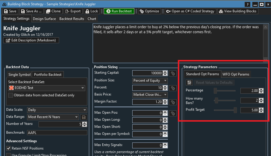 The Strategy is run with whatever settings are in the sliders on the Strategy Settings panel, can you check those?