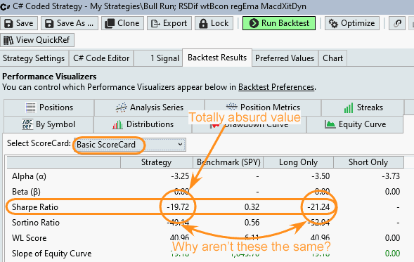 Look at the Post #4 screenshot. Notice that the two Sharpe Ratio calculations don't match up even though they should. That's because the backtester is delivering different bt.Positions ProfitPercent values to the Basic ScoreCard extension for the "Strategy column case" and the "Long column case" invocation when it shouldn't be. But the problem is proving it and reproducing it--that's tricky.