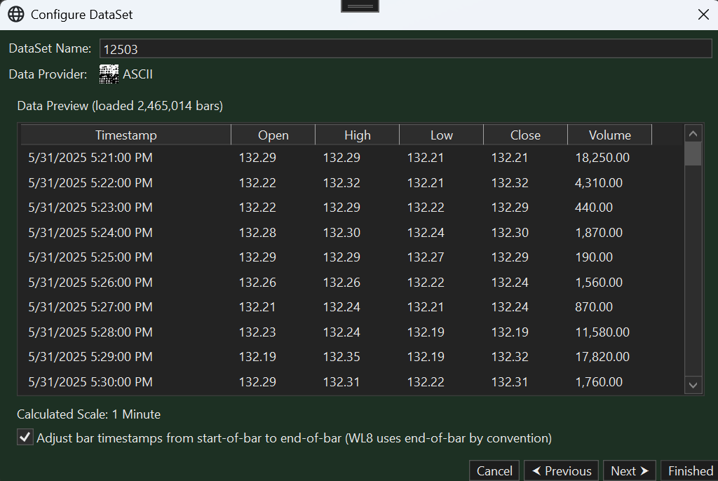 And, because you're scaling, you should have the "Adjust bar timestamps" box checked when setting up the DataSet -