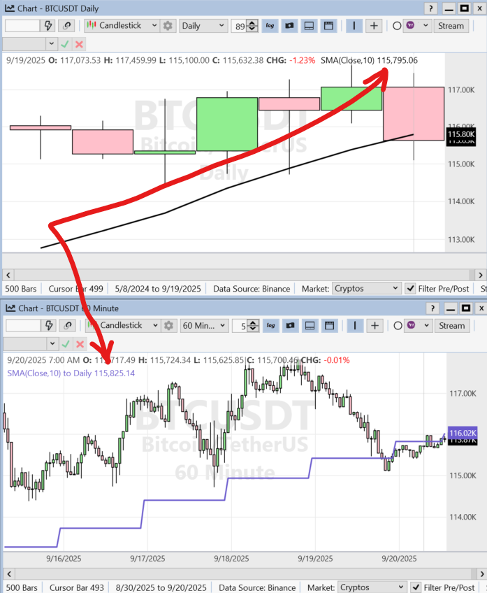 If I understand correctly, the indicator values on the daily chart and the Scaleind (to daily) on the intraday chart should match. But they are different.