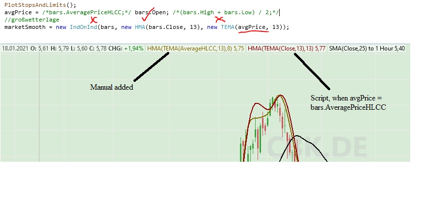 IndicatorBase marketSmooth = new IndOnInd(bars, new HMA(bars.Close, 13), new TEMA(bars.AveragePriceHLCC, 13)); PlotIndicator(marketSmooth );
