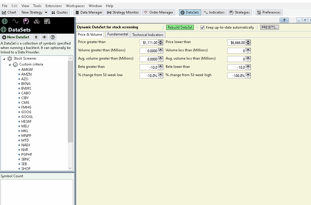 At first there's just one criteria active (price within $1,111 and $6,666) which results in 22 symbols. Then I'm activating a filter on the 14-day RSI above 66 and upon clicking Rebuild, the DataSet gets instantly updated with just 4 symbols.
