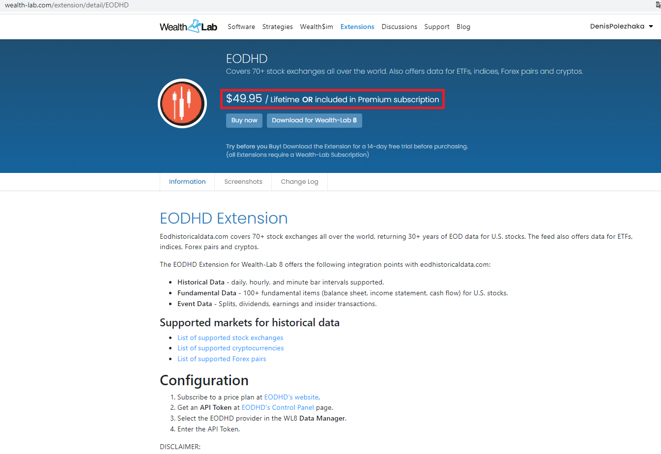 I use the EODHD extension in the WL8 terminal. When I registered on the EODHD website, I saw that I had an "All Exchanges/FREE" tariff plan. However, the EODHD extension page on the Wealth Lab website states that as a premium user, I get some privileges.