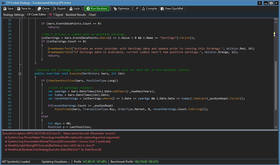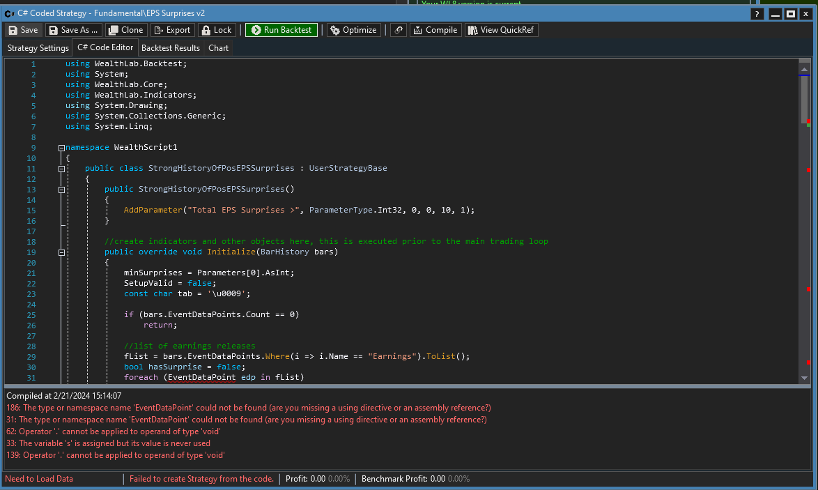 When I run EPS surprisesv2 strategy from fundamental folder it spits out this error message in the bottom of attached screenshot. I do have fundamental extension installed. I am on build 80, using default setup.