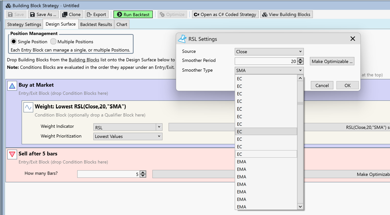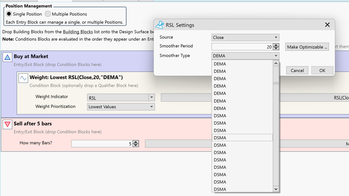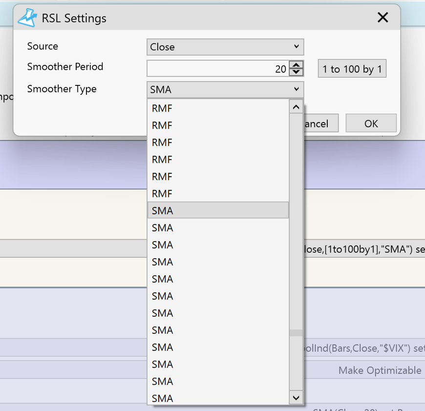 Hello, I like to use and optimize the RSL Indikator-great indikator. But if I select the RSL the optimization settings are empty. I also tryed to use RSI at first (first picture below) -it works-, and then select the RSL ... same problem no settings and no possibility to start optimization (second picture below.