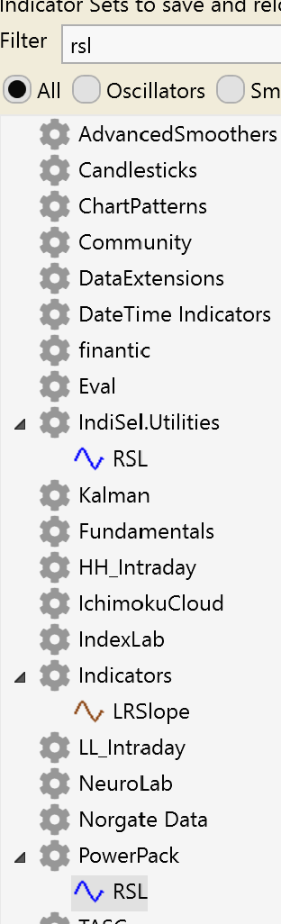 the PowerPack extension added the "Relative Strength Levy" indicator and chose the abbreviation "RSL" for this one. Form this time on there were two "RSL" indicators