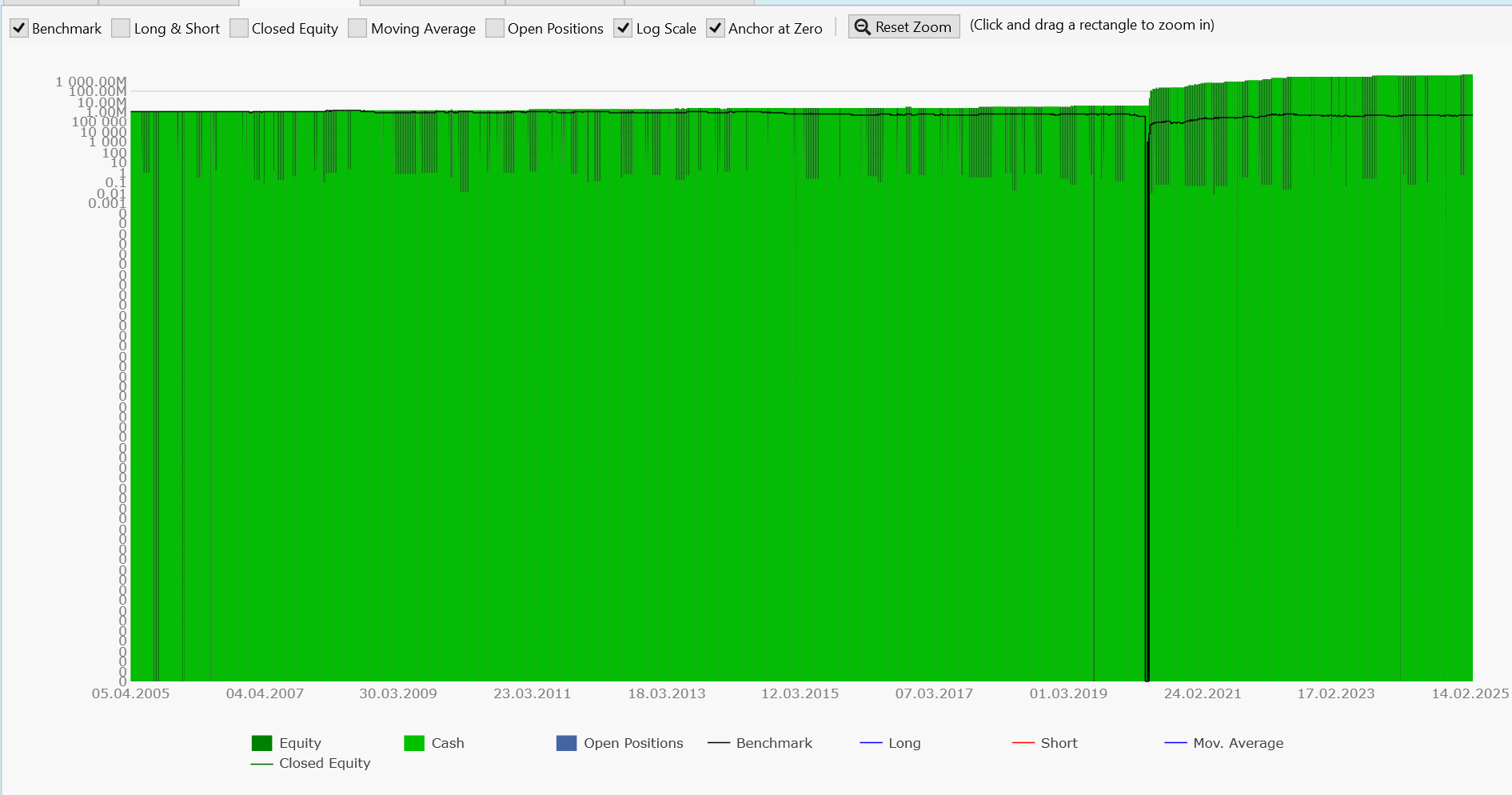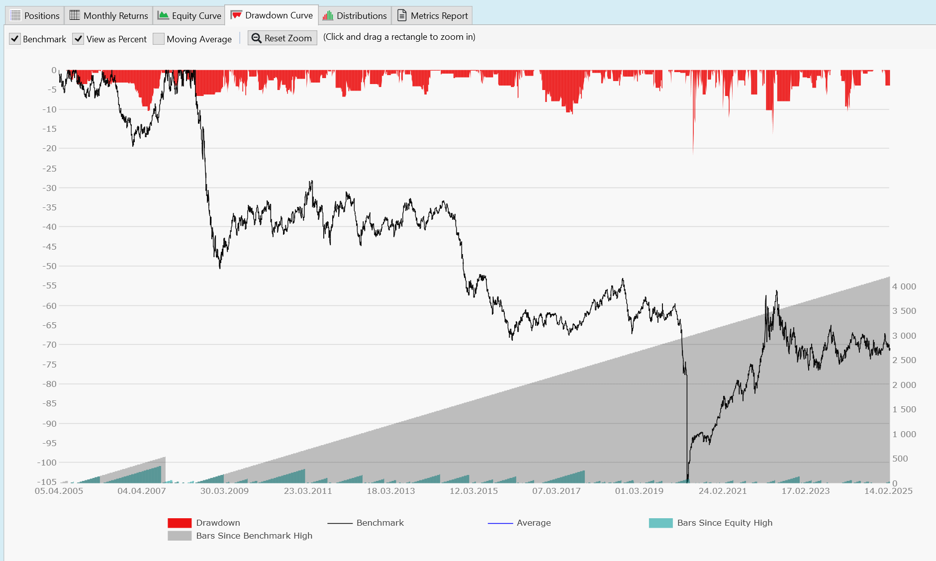 I don't know of any other sources of continuous futures that don't have a negative price. And it's not the equity curve that goes to zero, but the benchmark that looks weird on a log scale. The maximum drawdown of this strategy is 33% in 2020.