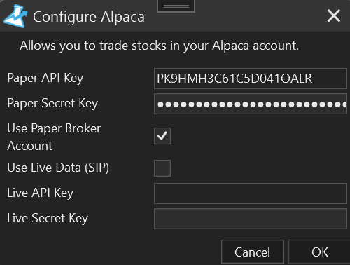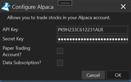I do notice though that when I go to the Data Manager then Streaming Providers, it has already populated my API & Secret Key for Alpaca. If I delete the API Key & Secret Key in the Data Manager, then go back to the Order Manager, the API Key & Secret Key are cleared out so the Green Connect button is not available to click on without populating them again under Configure. You probably already knew this and it is inconsequential, but I was just making an observation hoping that it might be useful to helping you troubleshoot this.