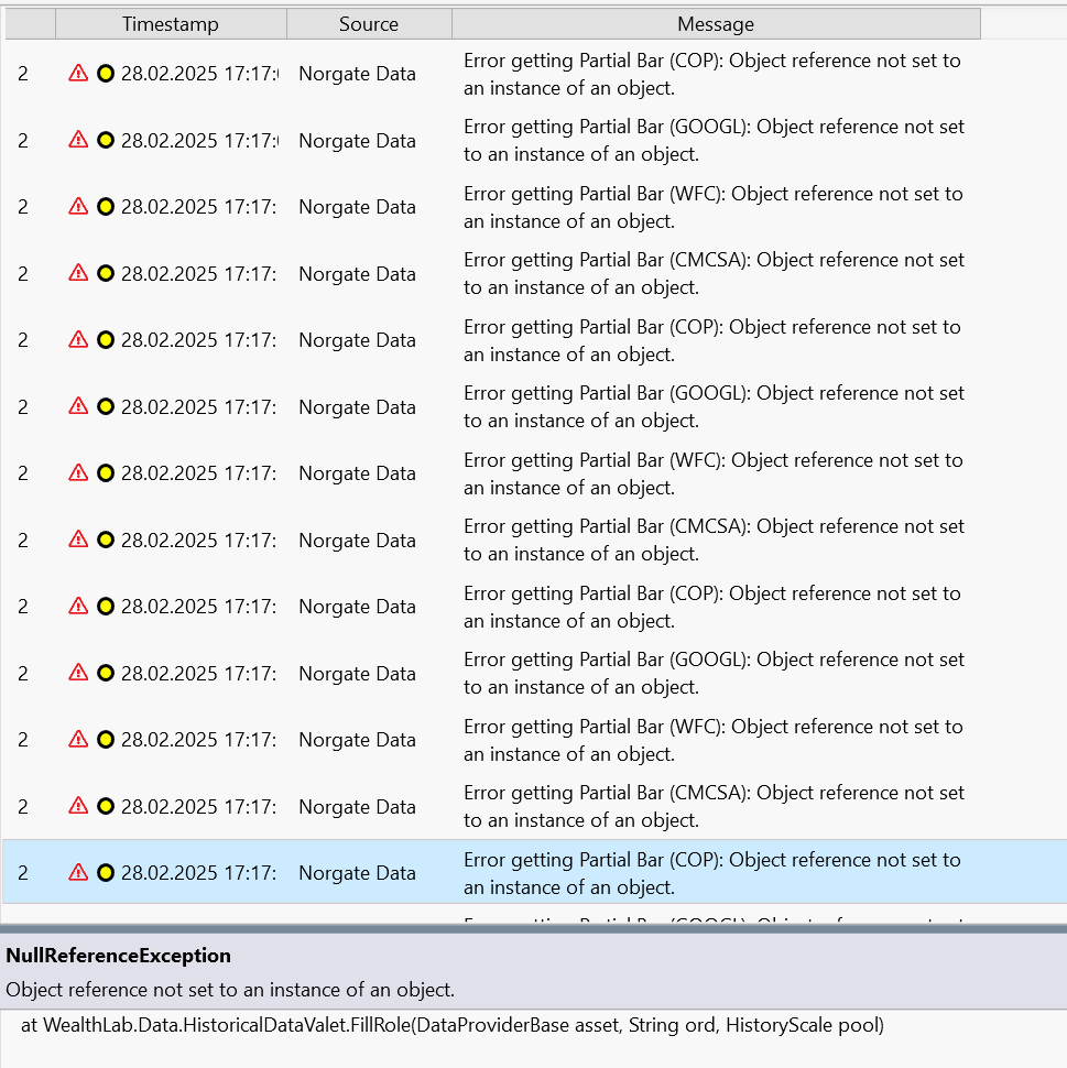Lately, I keep encountering errors supposedly related to receiving data from NorgateData for stocks. However, I don’t use NorgateData for stocks—I only have a subscription for futures there. For stocks, I exclusively use the DataSet SP100 from WL.