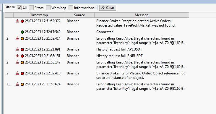 Left the strategy run overnight , some new errors appeared in log viewer :
