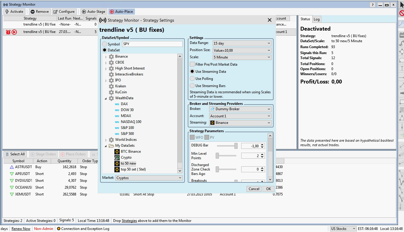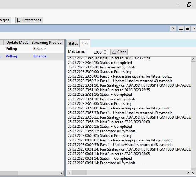 Ran strategy on Dummy Broker to compare with Live Binance - the result is there were signals after 1 run ( 5 min scale).