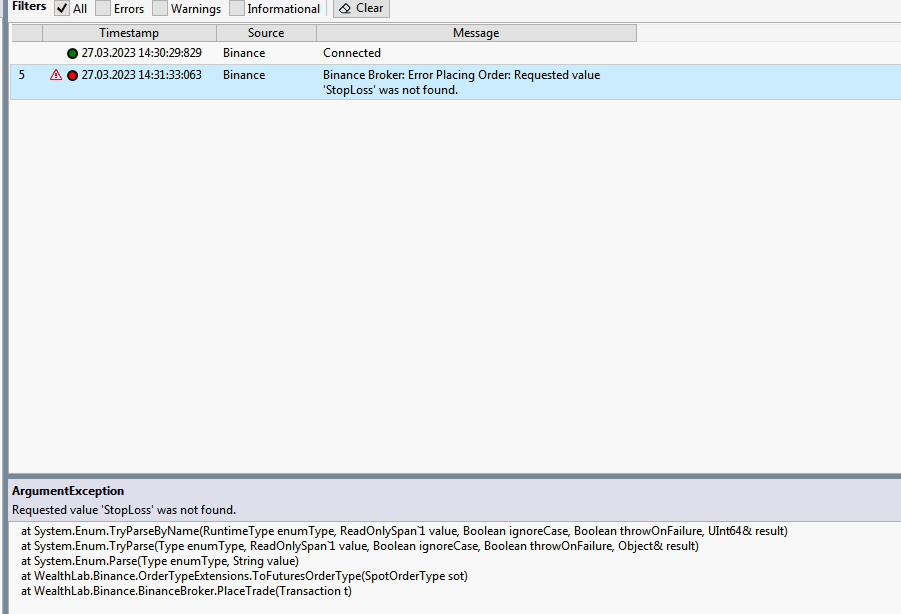 "Binance Broker: Error Placing Order: Requested value 'StopLoss' was not found."