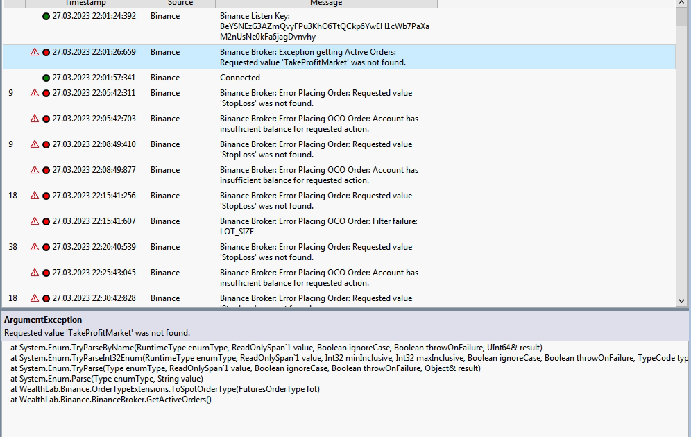 The illegal character issue first appeared in your post here - https://wealth-lab.com/Discussion/9353. Maybe we didn't run it long enough to see it, but after the round of releases with Build 33, we noticed that CryptoExchange.Net (used by the Binance Provider) "fixed order deserialization when trailing delta timestamp is present" which sounds related.