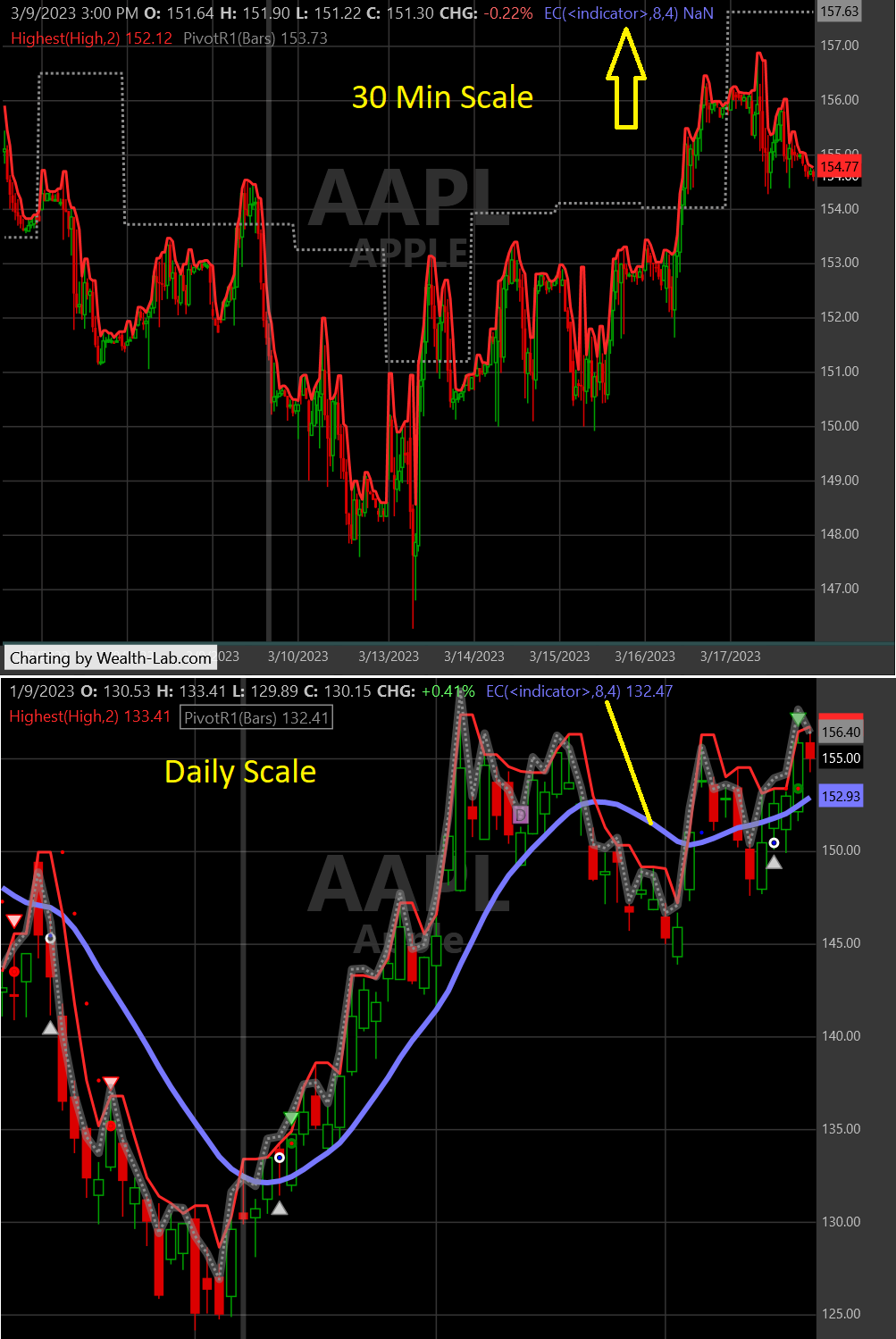 Yup, PivotR1 is a Daily indicator. In the 30 minute scale the EC indicator applied to Pivot looks to be a solid NaN (not a number).