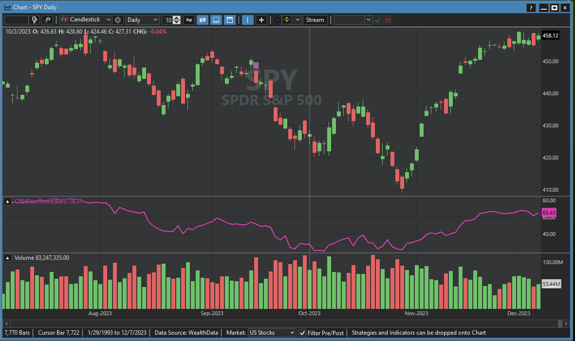 Thanks to Springroll for pointing me to the link to download the CNN Fear/Greed Index historical data! I've integrated it into an indicator for PowerPack, but the site only returns data back one year.