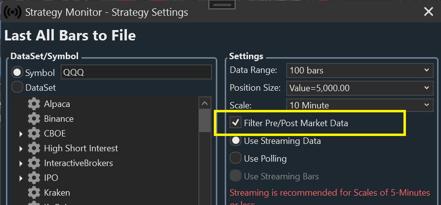 That was a quick test. If you enable the Pre/Post filter here, it won't even schedule the first run until the market opens, and the data is filtered.