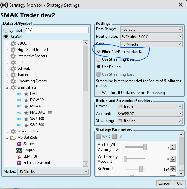I was getting erroneous signals when running in the SM, (works fine with SW), particularly in the early hours of market open. Outputting the indicator values to the Log Viewer, I could see the indicator values were not correct when there was a false signal, as determined by comparing these values to a streaming chart I run in parallel (for viewing only, with 10-min streaming data also from Tradier). I noted that if I deactivated the strategy and reactivated, it would begin to provide accurate indicator values and it discarded the pre/post market data from the strategy. There is no pre/post market data in the chart.