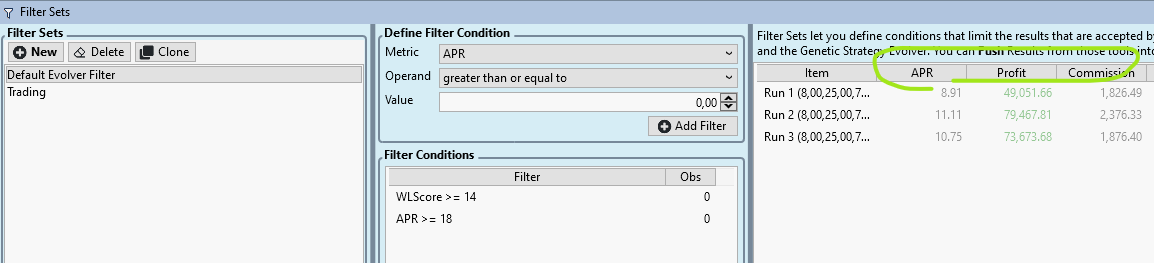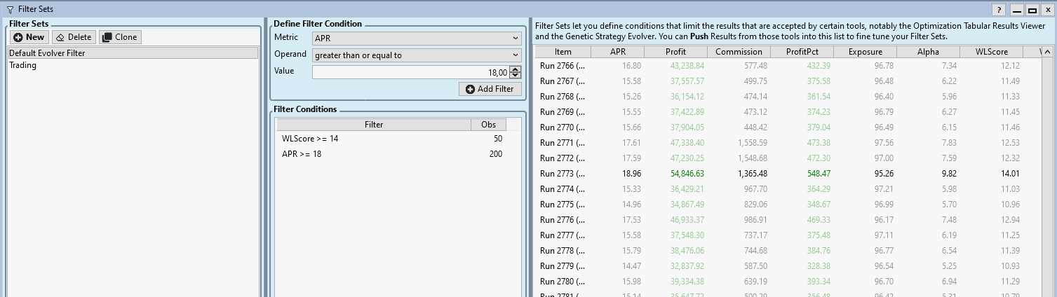 Sorting columns works fine in the backtesting results but not in the filter set window.