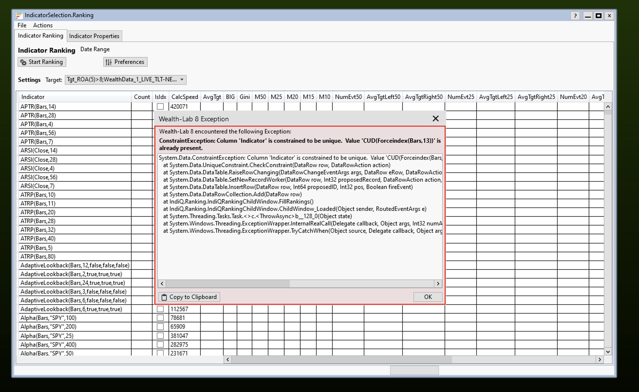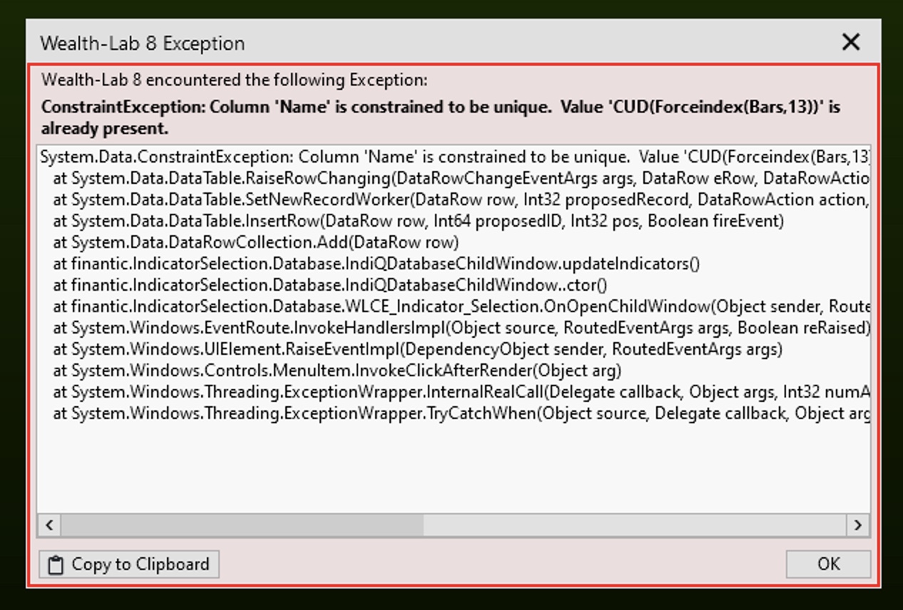 The problem is, that I cannot open Indicator.Selection Database. It just shows this exception.