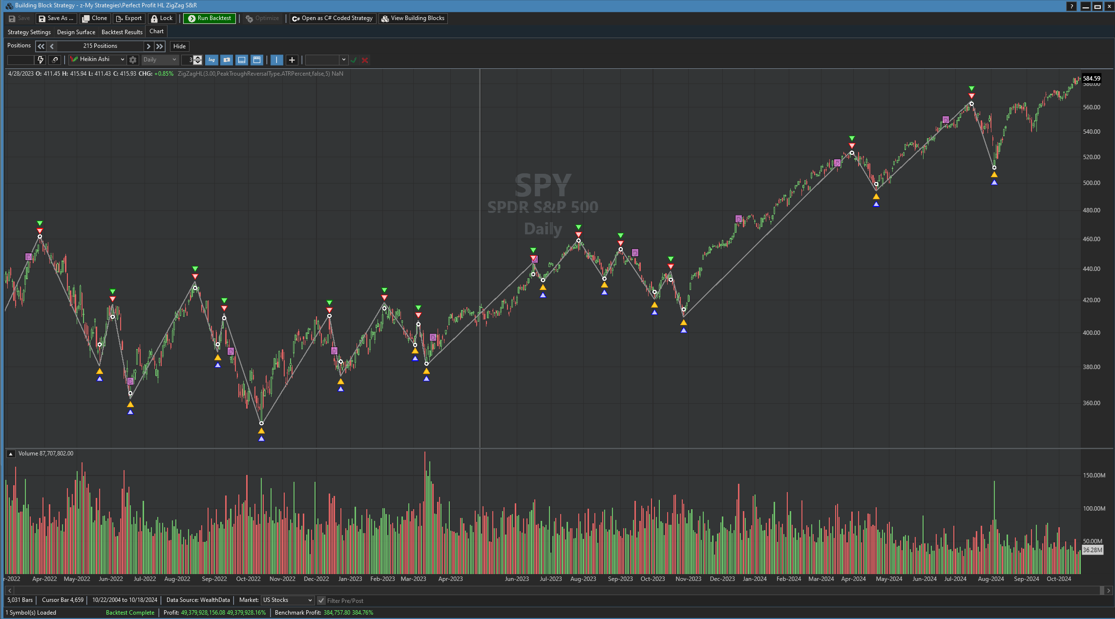 Here is a perfect profit strategy I built last year using building blocks. It's a simple stop & reverse strategy using the ZigZag HL indicator that peaks ahead 1 day. In my testing I think this is only useful for curve fitting/machine learning algorithms like the famous "Trading System Lab". Since these algos need a target to curve fit, perfect profit strategies are ideal.