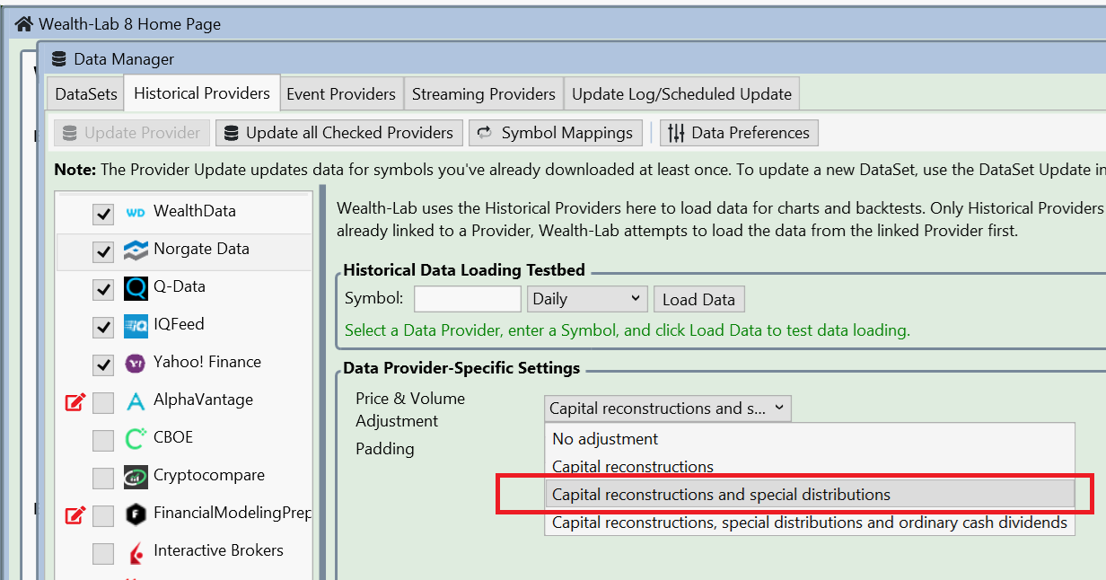 You haven't configured Norgate for these adjustments. I'd recommend this setting.