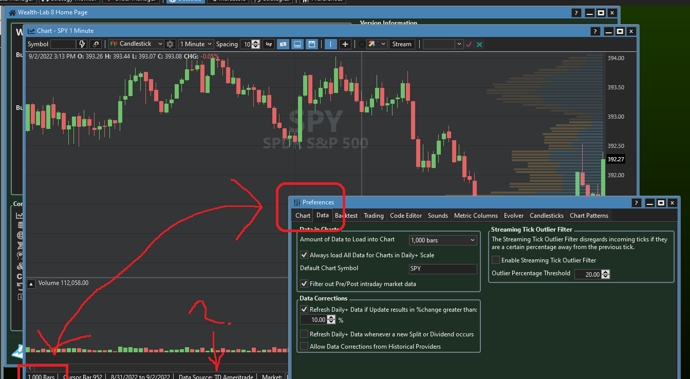 First, the confusion about how WL8 determines how much data to load in a chart. It's specific in the Preferences, Data tab, as shown here in the image.