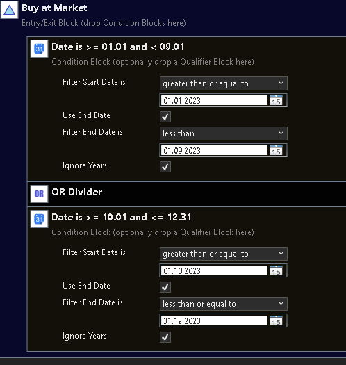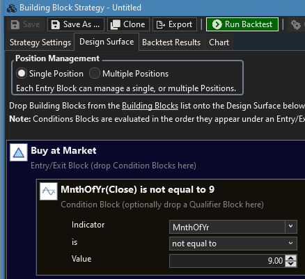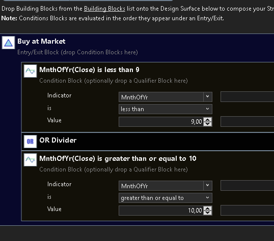 I want to exclude a specific month of the year such as September from backtesting, if i drop mnthofyear from powerpack it gives me a dropdown list of many options related to indicator vs other etc. which I dont understand fully. Same thing to exclude a day of week, day of month too