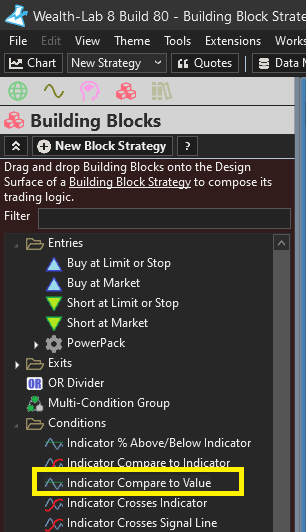 In the Building Blocks pane on the left, drag the Indicator Compare to Value condition into your building block...