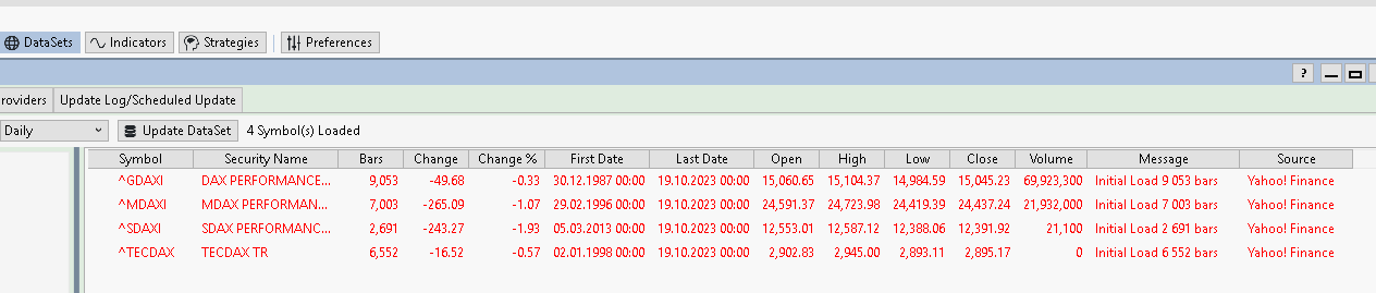 The dynamically updated DAX and MDAX indices can be found under "WealthData" in the DataSets tree on the left. (Other *DAX indices aren't supported). This means that once a symbol enters an index, the backtester will use it; once it's out it won't be included. Backtests on these DataSets benefit from being survivorship bias free which is pretty unique. Our WealthData feed tracks ongoing changes to DAX/MDAX and maintains an extensive history of them since the 1990s.