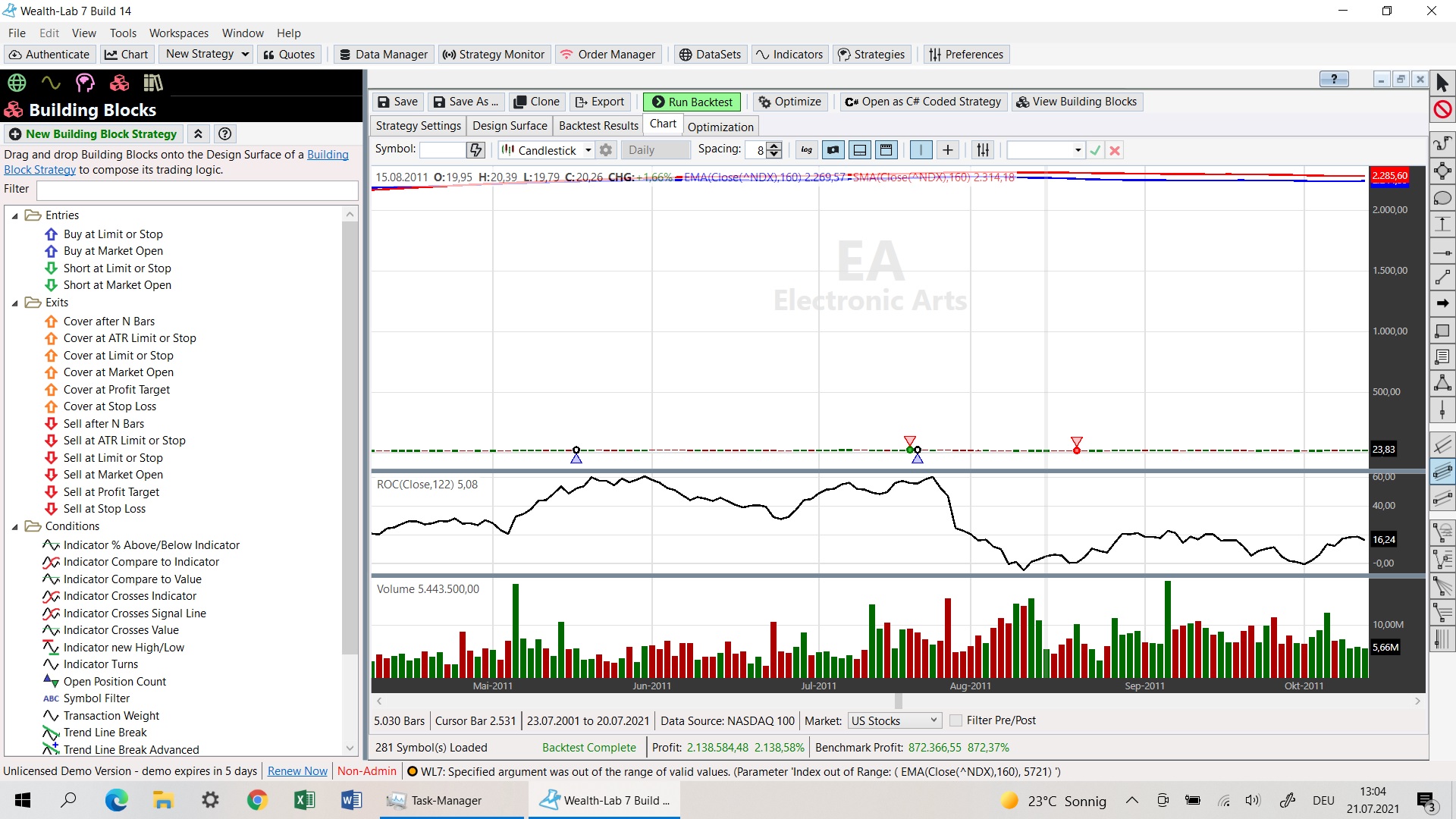 I see what's causing this, in the Blocks you've chosen an external symbol (e.g. indicator symbol = ^NDX) whose price range is far different from the symbol being charted (i.e. EA). Indeed it would help if Wealth-Lab plotted the secondary symbol on its own Axis Y2 or in its own Pane. A workaround is to "Open as C# Coded Strategy" and make the code plot the ^NDX with its derived indicators in its own Pane.