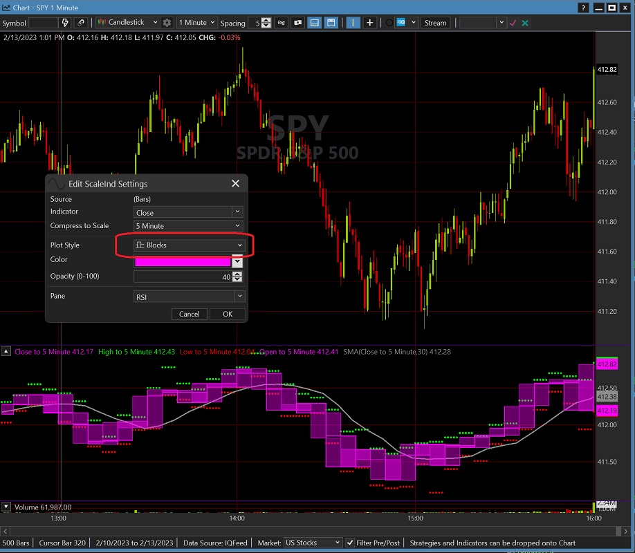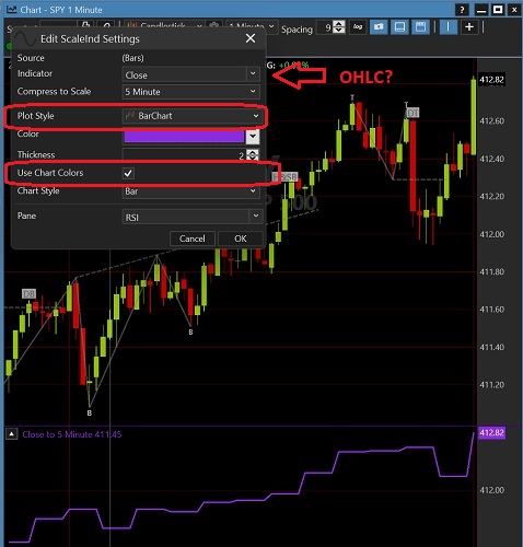 I'd like to know if it's possible to show candle bars in another timeframe using ScaleInd as it is shown in image below using 1 min bars and 5 min bars in pane below. The ScaleInd Settings does not give me a choice for OHLC bars only averages of it even tho it has choices for PlotStyle BarChart and Use Chart Colors. See image below. Thanks.