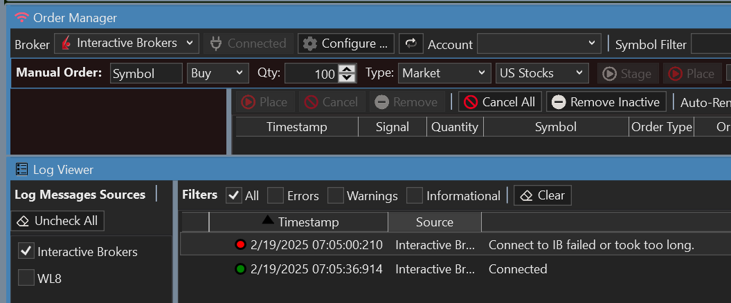 Upon connecting IB has always automatically sent a list of accounts for the login, but it seems hit and miss this week, and there's no way to recover except to restart WealthLab until it works.