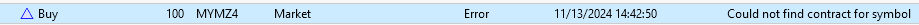 All I’m doing is placing an order manually for MYMZ4 in the Order Manager using Interactive Brokers. Why would it not work? This is not about datasets or symbol mappings unless I forget something.