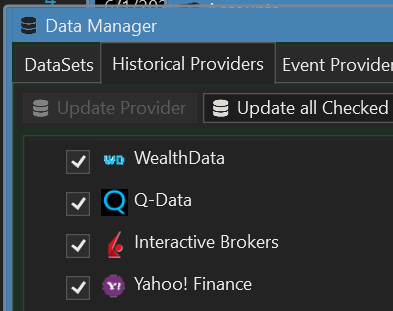 Now that that's solved and if you trade US Markets. I'd recommend this order so that Daily data come from Wealth-Data and/or Q-Data. IB will then be the first choice for Intraday data.