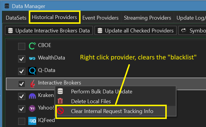1. If a data request error occurs for whatever reason, that symbol is put on the Provider's "blacklist" for the current WL session. If you did something to correct the condition, to clear the blacklist for the session, do this and try the request again.