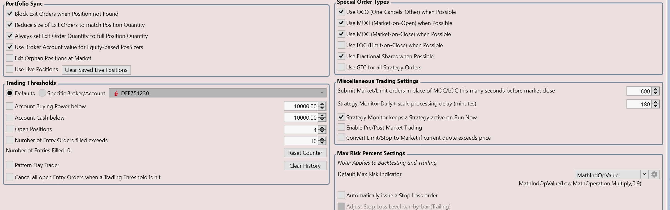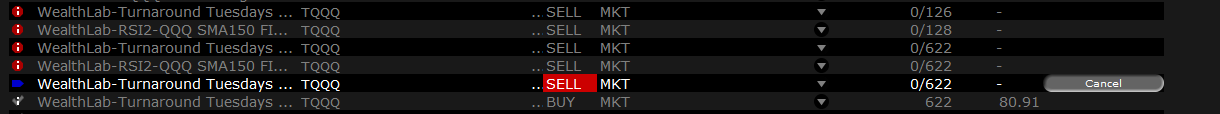 I have two block strategies the both trade TQQQ. One of them (WealthLab-Turnaround Tuesday) triggered yesterday and was filled this morning with 622 shares. Today after the close, both strategies had a sell signal triggered. At first both generated a sell order, one with 126 shares and another with 128 shares. After noticed that I canceled them. After reading the trading instructions in help, I enabled some options in the trading preference (attached in the screenshot). Then I rerun both strategies and now both strategies triggered a sell and both summitted an order with 622 shares.