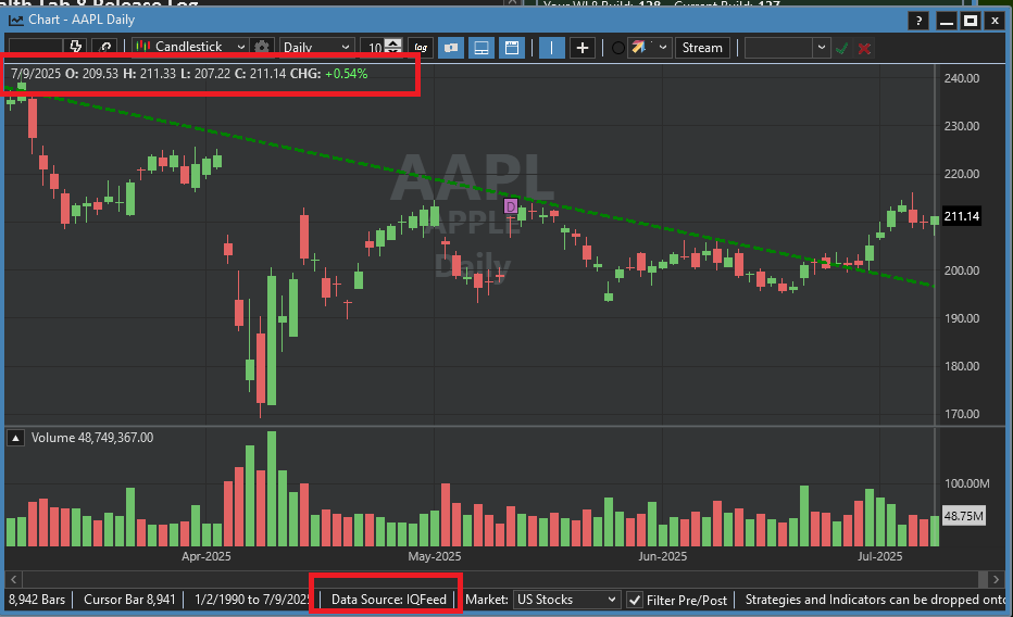 I did notice that on the bottom of your daily screen shot, your data source is IQFeed as opposed to mine which is Wealth Data; How do I change the data source from Wealth Data to IQFeed? The Wealth Data is not uploading the EOD prices. Even in the back-testing process, Wealth Data is not uploading daily data after 7/1/25.