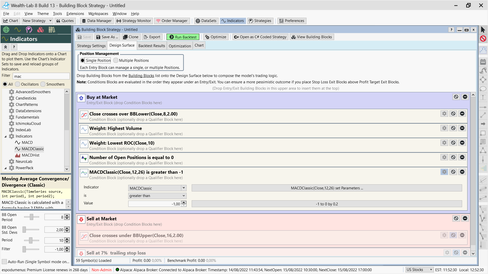The general feeling is, if the strategy entered a "trade" (not an investment) which is not giving some immediate satisfaction, then it should be exited. That's kind of a hard pill to swallow, and perhaps that execution should be tempered with a strategy parameter the optimizer can use to temper that thinking. We want to employ an indicator that judges "How immediate?" and by "How much?" of a decline. Currently, I'm using the MACDhistogram to answer both of these questions with the threshold for selling the position being adjustable by an optimizer parameter.