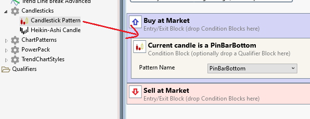 Now, you can select PinBarBottom from the Candlestick Pattern condition -