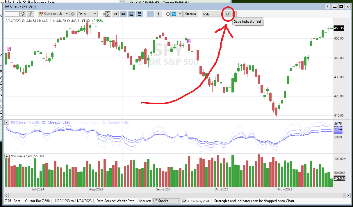 The drop down at the right end of the toolbar contains Indicator Sets that you previously defined. Indicator Sets let you save groups of Indicators that you drag and dropped onto the chart in a named set. Use the green check-mark button to save a new Indicator Set after providing a name. Once you have a few Indicator Sets saved, you can use the drop down menu to quickly switch between your preferred indicators on any chart.