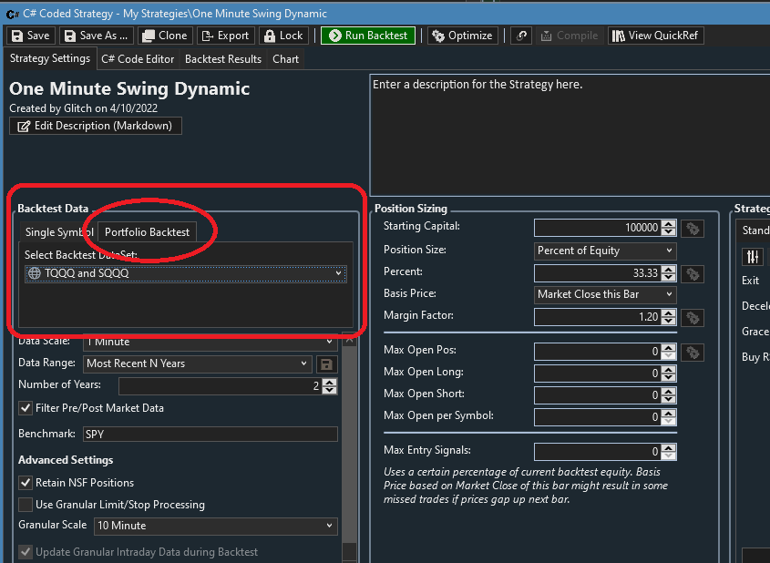 2. Open your Strategy and forget about selecting a DataSet from the left panel. Select in Strategy Settings > Portfolio Backtest.