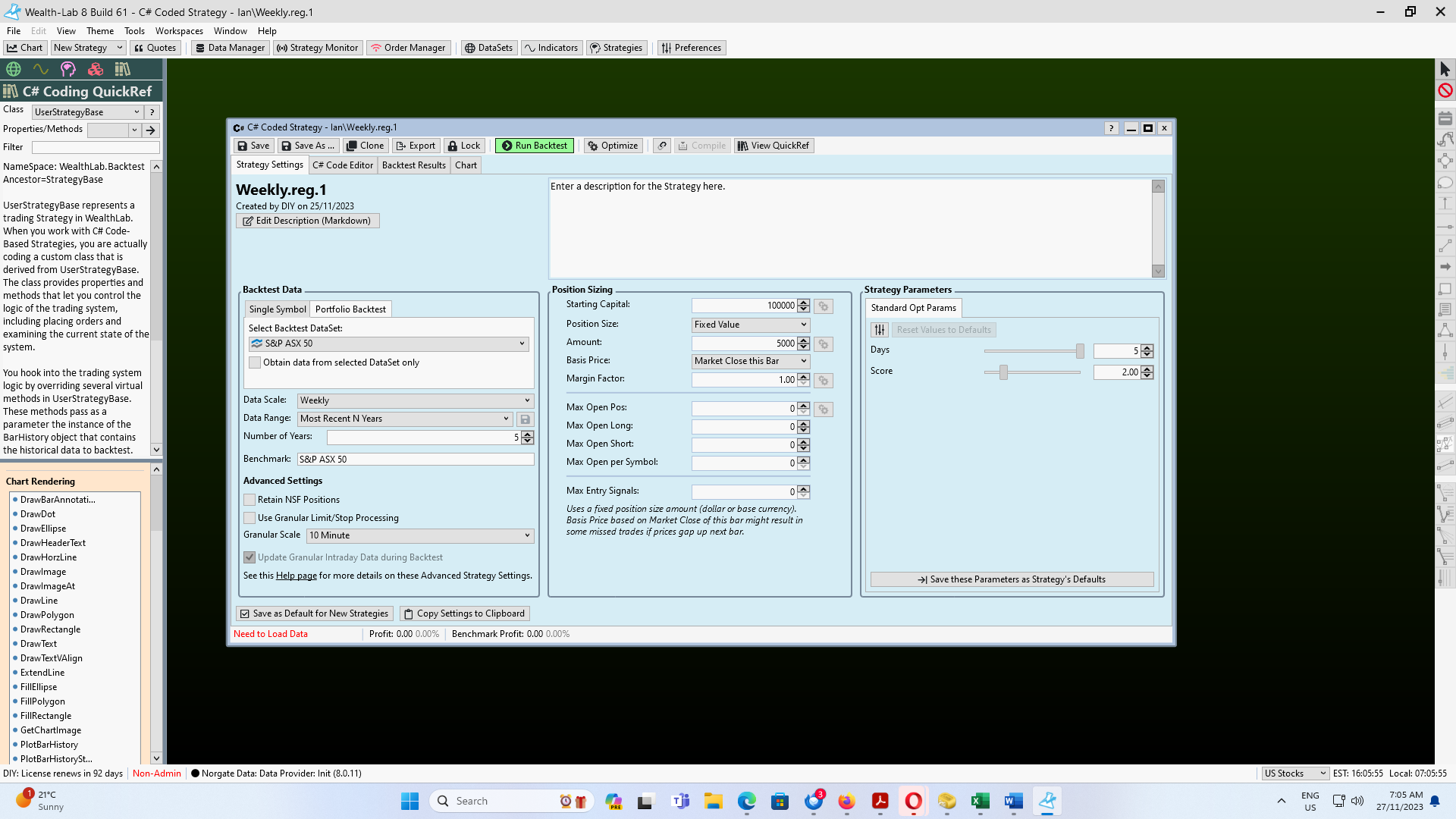 - The Strategy window with C# Code Editor opens (as per chart attached)